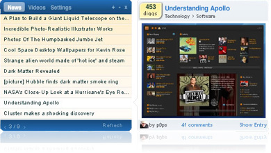 This application demonstrates many advantages to the Adobe AIR runtime, including how well Adobe AIR applications can interface with web APIs such as the Digg API to create highly customized user interfaces.