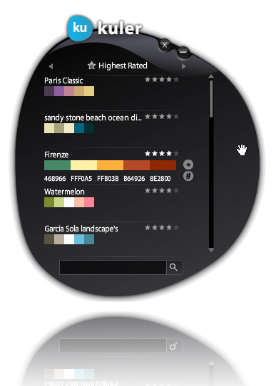 Kuler desktop is a rich Internet application (RIA) that has hundreds of community-contributed and -rated color schemes. Initially released as an application on Adobe Labs, the Kuler team recently released an Adobe AIR version that is extremely stylish and useful.