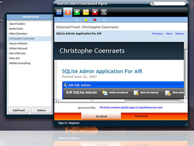 The Flex developer community is pushing new ground every day. One way to keep up with the community is to install the SearchCoders/Dashboard, which makes extensive use of Adobe AIR capabilities. This Flex based application has many brilliant, community-focused features.