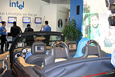 The Pentium M-based Car PC, which is built into a Mini at the Intel booth, also made a cool guest appearance. The computer fits into the car stereo slot and is controlled via touchscreen or voice recognition. Communication runs via GSM, GPRS and UMTS. Bluetooth can also be used to connect PDAs and notebooks to the system. And there is more, the Car PC can synchronize data with your home computer via WLAN, for example for music and movies.